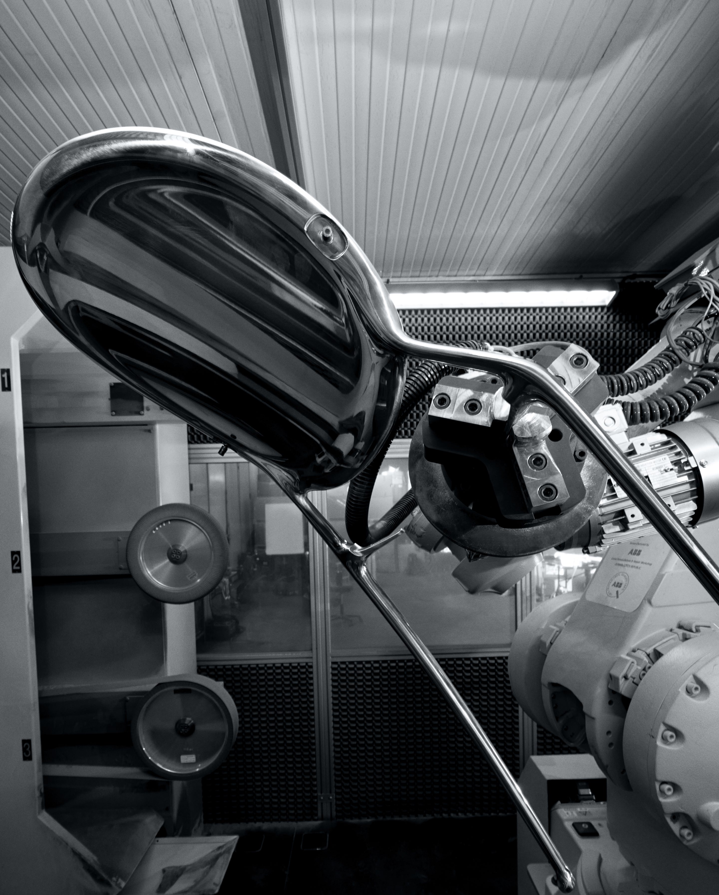 Once molten, the liquid aluminum is poured into a concrete tank called a crucible, and then injected into a meticulously adjusted mold. A tremendous mastery of the material is then implemented to produce an infinitely precise form, adapted to the unusual architecture of this creation. Then the pieces are cleansed of any imperfections in a final polishing stage before being dipped in an electrolytic bath for the black chrome and pink copper versions, or vacuum sprayed for the gold one.
