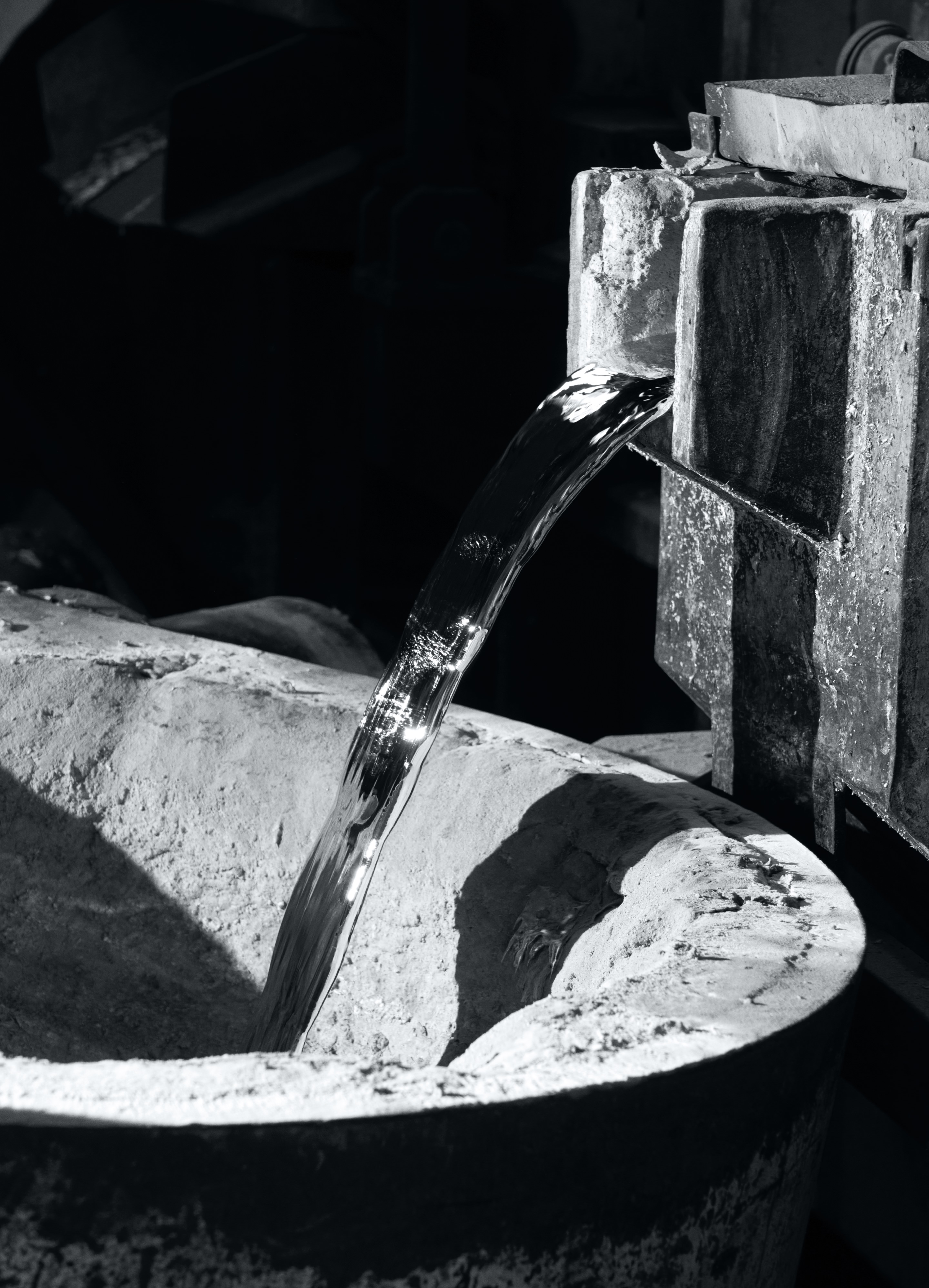 Once molten, the liquid aluminum is poured into a concrete tank called a crucible, and then injected into a meticulously adjusted mold. A tremendous mastery of the material is then implemented to produce an infinitely precise form, adapted to the unusual architecture of this creation. Then the pieces are cleansed of any imperfections in a final polishing stage before being dipped in an electrolytic bath for the black chrome and pink copper versions, or vacuum sprayed for the gold one.